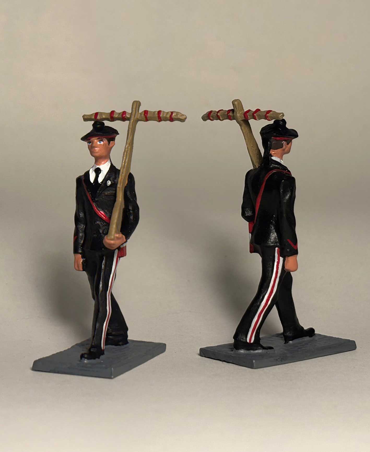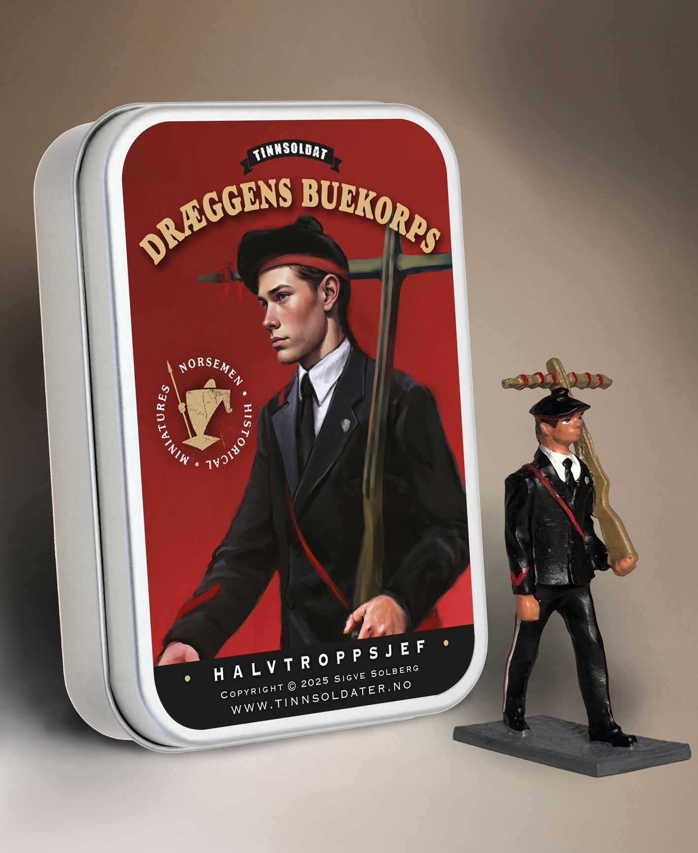 Håndlaget tinnsoldat av Halvtroppsjef i Dræggens Buekorps. Figuren leveres med en fin metallboks.