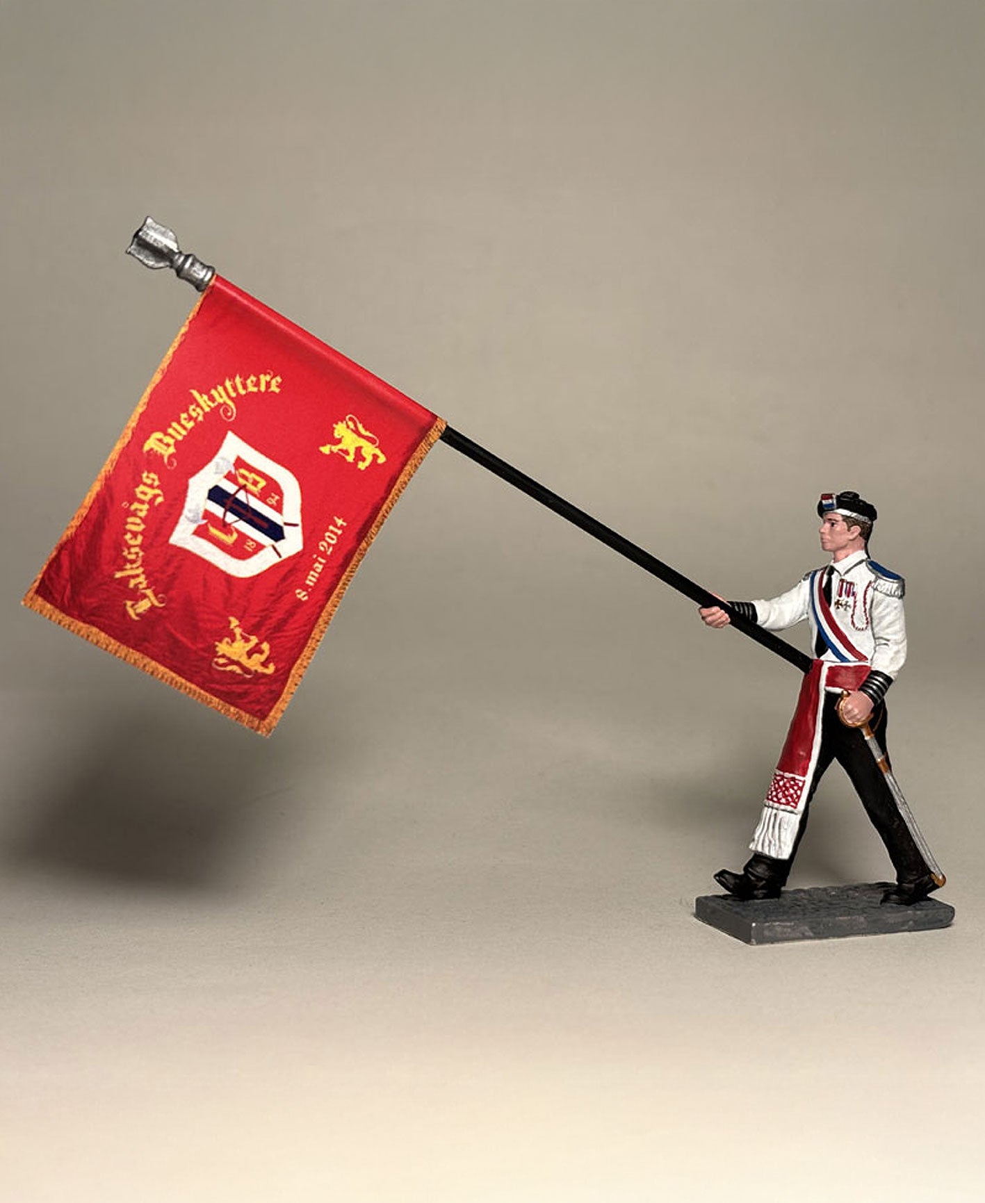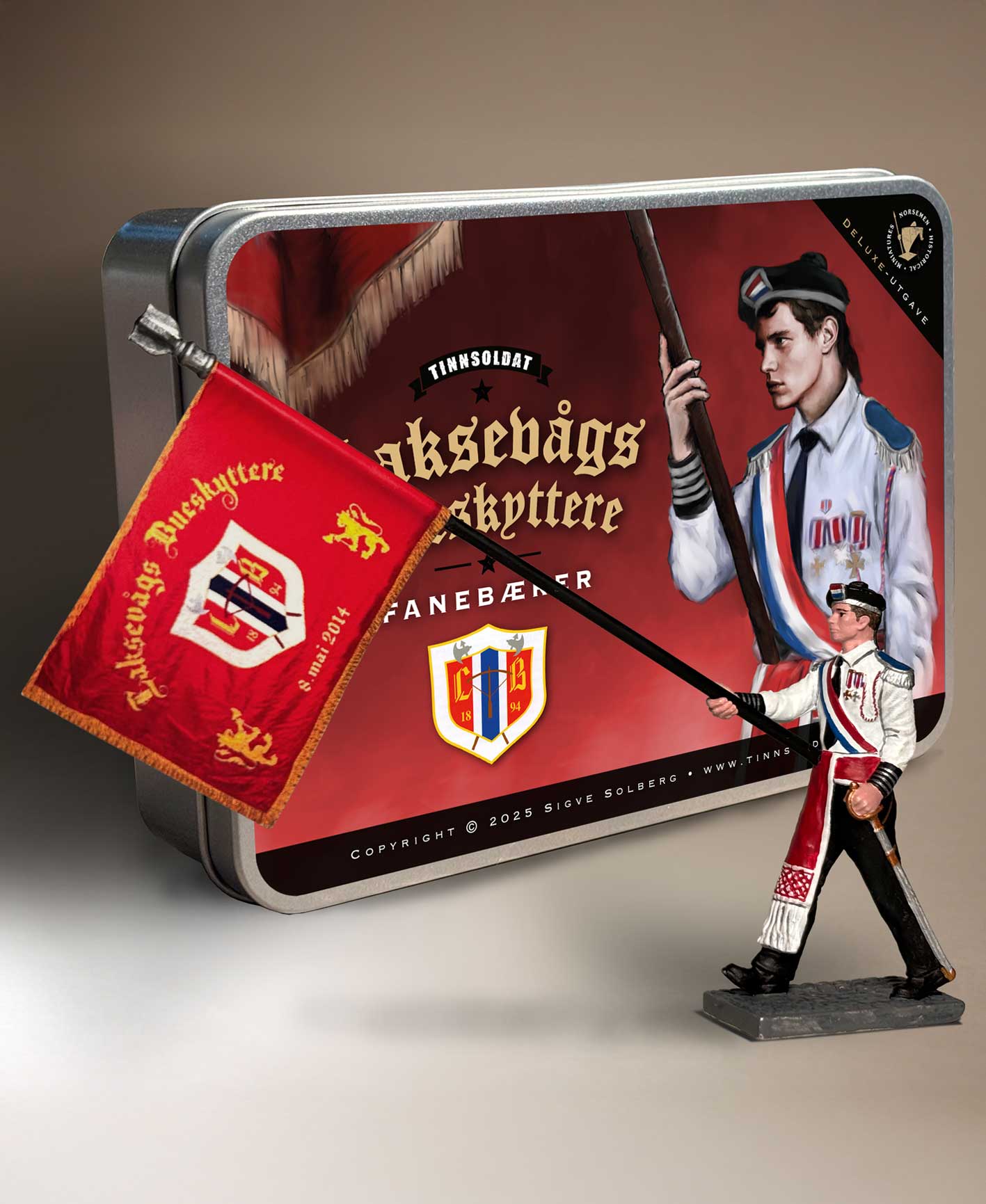 54 mm håndlaget tinnsoldat av Fanebærer i Laksevågs Bueskyttere. Dette er en DeLuxe-utgave med høyt detaljnivå på både tinnsoldat, fane og fanespyd. Figuren leveres i en flott større boks - som også inneholder en folder med historien om Laksevågs Bueskyttere. OBS. Kun et lite antall eksemplarer i hver produksjon.