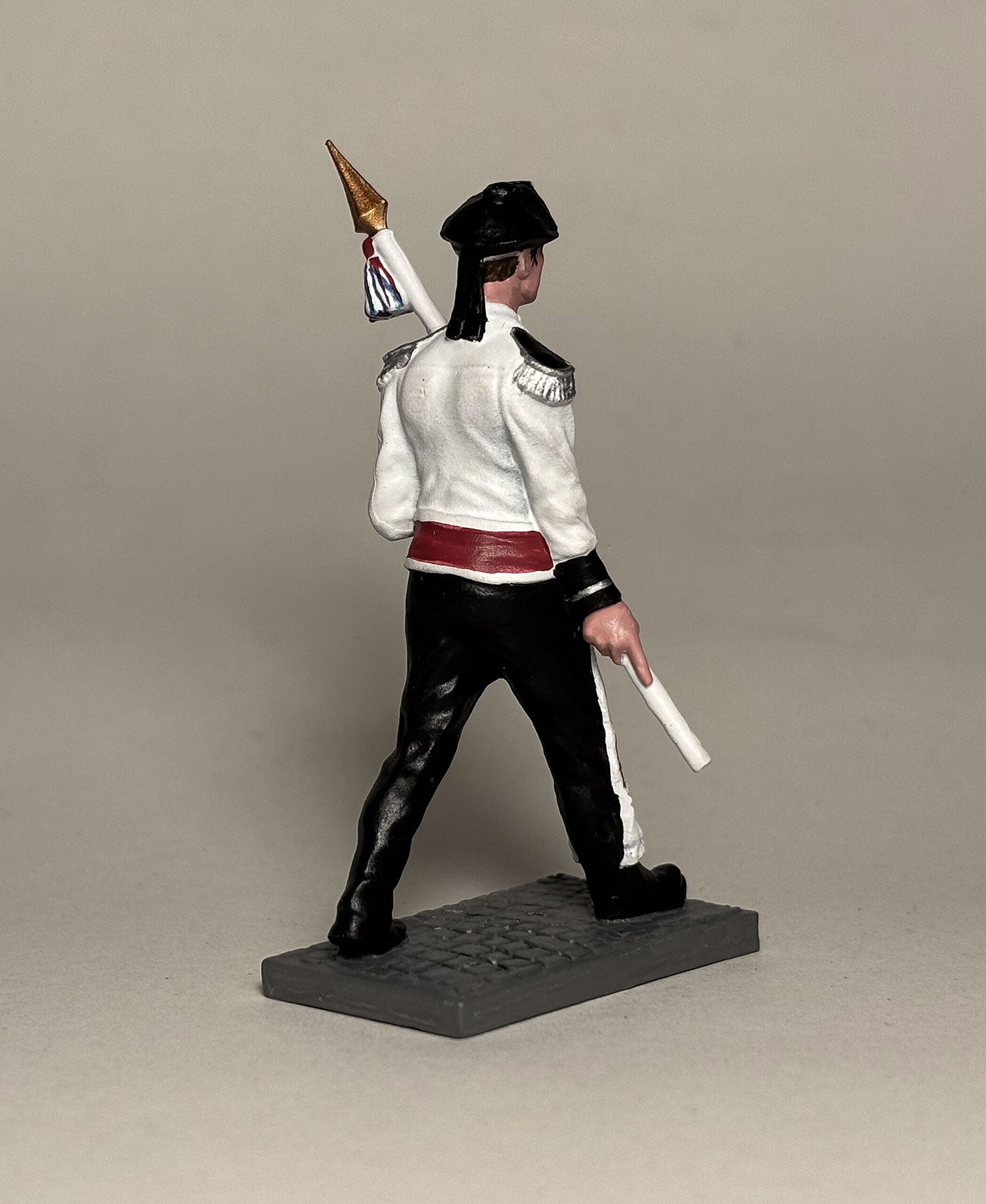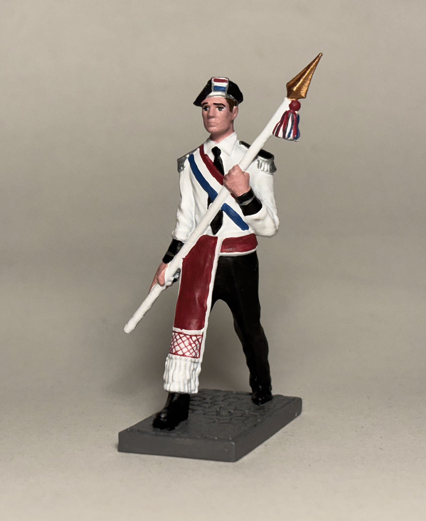 54 mm håndlaget tinnsoldat av Spydbærer i Laksevågs Bueskyttere. Figuren leveres i en flott metallboks.