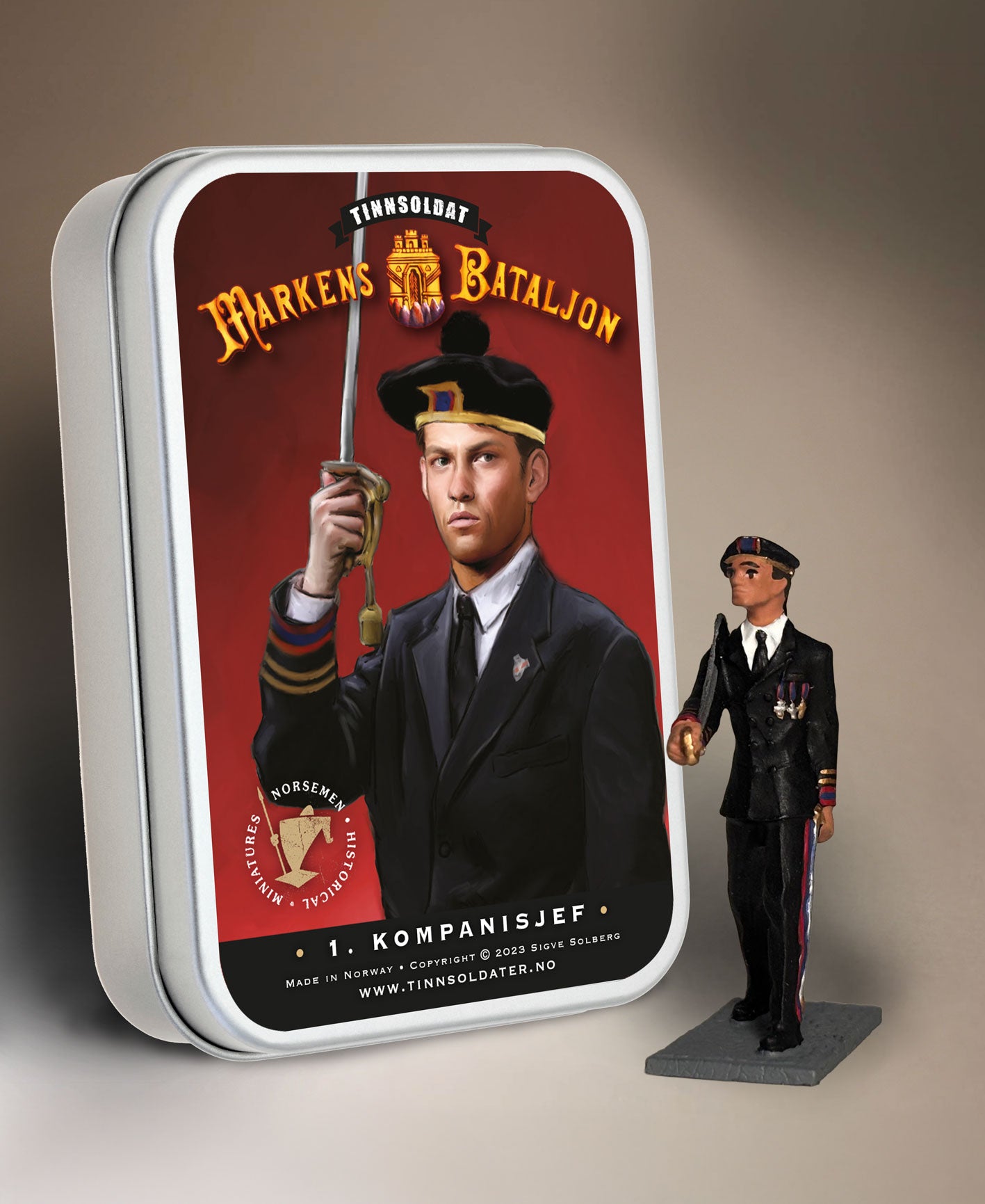 Håndlaget 54 mm tinnsoldat av 1. Kompanisjef i Markens Bataljon.